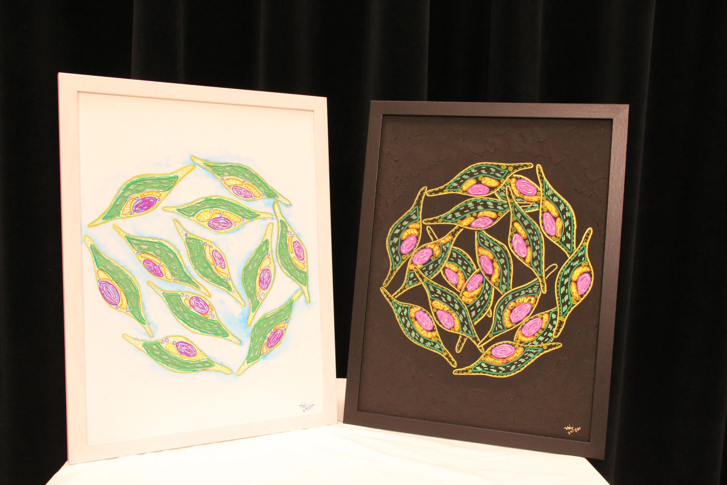 An interpretive illustration, Under the Electron Microscope, showcases the imaging of the model diatom, Phaeodactylum tricornutum (PT). It is an 18 x 24 canvas illustration that depicts the lead author's view of the diatom at 50,000 times magnification. Diatoms are a special class of algae with silica cell walls (commonly known as quartz, a glass-like substance), which make up 40% of the phytoplankton abundance in the ocean. The lead author has demonstrated different types of electron microscopy imaging techniques, including scanning electron microscopy (SEM) and transmission electron microscopy (TEM). Electron microscopy uses electron beams to create magnified images. an electron is a negatively charged particle that orbits a very small particle called an atom, similar to how planets orbit the sun. SEM helps image the exterior surfaces of the sample, whereas TEM creates images by passing electrons through the samples. In our interpretive illustration, the lead author utilized SEM in the scientific study and interpreted the TEM for the interior organelle structure (the colored internal organs of the diatom) of the PT based on the current understanding of scientific literature. Zentangle art was used to create the abstract shapes of the organelles present in the diatom.