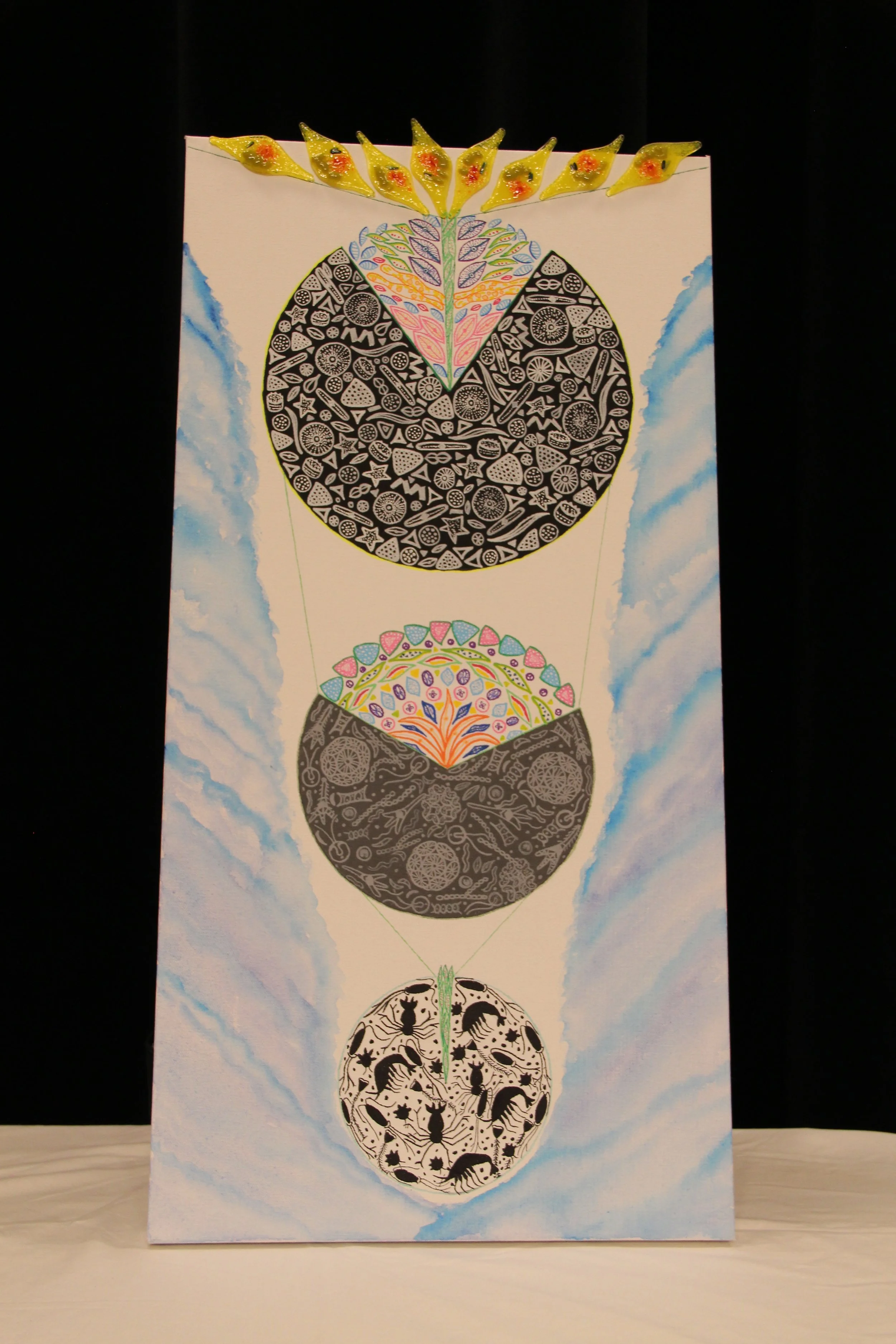 Diversity showcases the vast array of microscopic plankton found in the ocean. These tiny organisms drift along with ocean currents and tides, playing a crucial role in the marine food chain. Plankton primarily consists of microscopic plants, known as “phytoplankton,” and microscopic animals, referred to as “zooplankton.” This piece measures 16 X 40 inches and features three pie charts that emphasize the biodiversity observed in the ocean. Each chart represents biomass abundance, which is the amount of organic material, such as plants and animals, in a defined region. The pie charts are divided into focus groups (colored) and non-focus groups (black, grey, and white). The bottom pie chart illustrates the differences in biomass abundance between phytoplankton (colored) and zooplankton (black). The middle pie chart highlights the diversity within the phytoplankton group, specifically focusing on the diatom group of algae (colored). Finally, the topmost pie chart delves into the diversity within the diatom group, with a particular emphasis on pennate diatoms (colored), which contain the model diatom for this study.